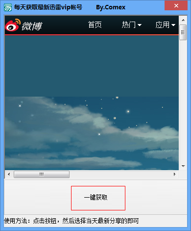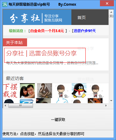 每天获取最新迅雷VIP帐号软件是一款免费实用的迅雷vip帐号获取器,软件小巧易用,有了它,你就可以获得迅雷的VIP账号,有需要的朋友赶快下载试试吧。