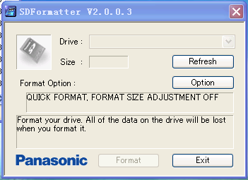 松下sd卡格式化工具能够格式化SD存储卡和SDHC记忆Card(SD/SDHC 存储卡),使用遵照SD存储卡规格来格式化,并提供对SD存储卡的更快和容易的操作方式。 软件使用接口环境:USB reader/writer, 可以读和写SD/SDHC 存储卡的读卡器。