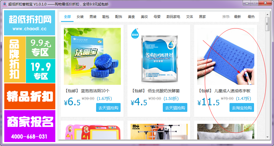 1、全场9.9元包邮专区:每天9点更新,上百款九块九包邮商品疯狂抢购,让购物更超值。