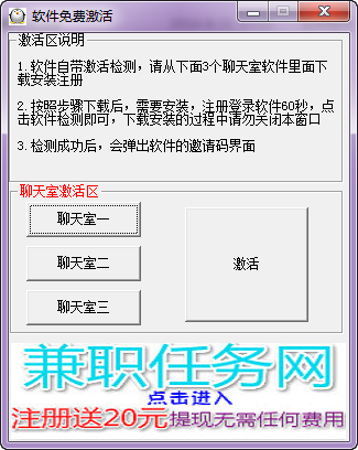 灵域激活码获取器所提供的激活码并非点击即可领取,而是需要下载软件内提供的聊天室软件,完成挂机任务才可获得