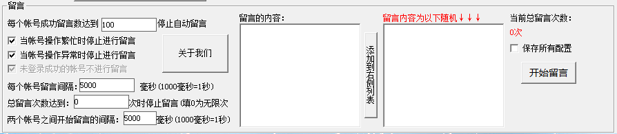 荣耀QQ空间多账号自动留言软件是一个绿色免费的QQ空间刷留言工具,用来帮助你在QQ空间留言板批量留言。支持自定义留言内容。软件绿色免费,使用方便,操作简单,能够帮助你快速提升QQ空间人气。