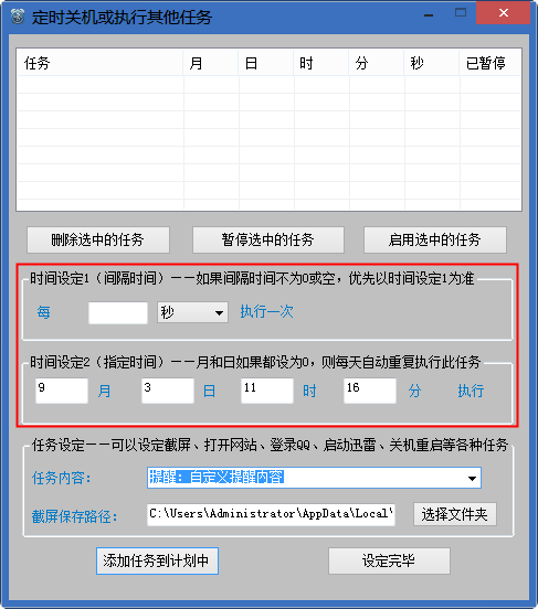 第一步,请先选择设置时间类型,“时间设定1”是间隔一定时间就重复执行一次,比如你可以设置每10秒钟自动截图一次,默认图片保存在C:\Program Files\CFSoft\SaveScreen下(如果你的系统安装在D盘,则是D盘的相应目录下),如果你想设定到特定时间才执行一次,你也可以先把“时间设定1”中的时间清空(如不清空,软件默认会以时间设定1的数字为准,则永远都是间隔多少时间后执行一次的模式),设置“时间设定2”中的时间,支持设置在某月某日某时某分定时执行一次任务,如果月和日都设为0,则每天到了你设置的某时某分,都会重复执行一次任务。