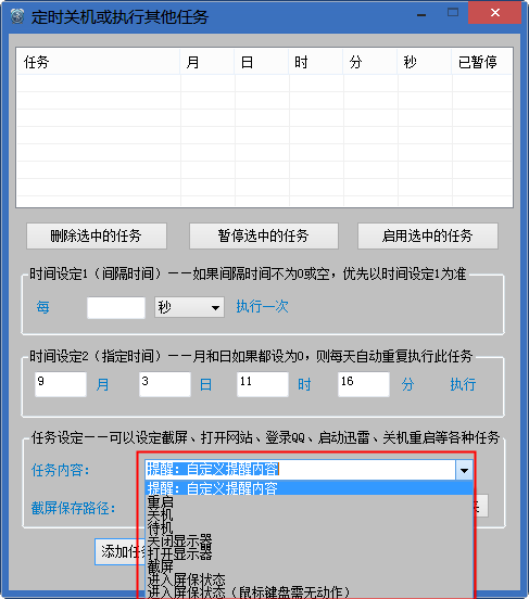 1.32版:增加了额外的控制参数,如果你想设置每天自动重复执行的任务在周六周日时不起作用,可以把月设成0,把日设成32 定时关机、定时提醒等功能的使用方法: