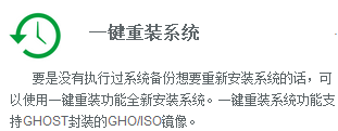 4、如果没有执行过系统备份想要重新安装系统,可以使用一键重装功能全新安装系统。一键重装系统功能支持GHOST封装的GHO/ISO镜像。重启之后会执行重装系统的后续步骤。