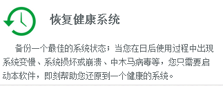 1、主程序兼容Win2003、Winxp、Win7以及WinPE系统。为避免部分杀毒软件误报,请尽量在运行程序前退出杀软或在安全类软件提示是否允许操作时信任本程序运行。初次运行程序会提示进行初始备份,点击一键备份系统按钮后根据程序提示选择重新启动。