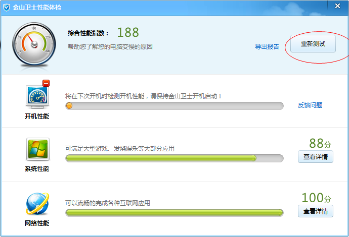 金山卫士性能体检是一款功能很强的软件,能耐帮你检查电脑系统的状态、网络运行的状态,操作简单,值得拥有哟!