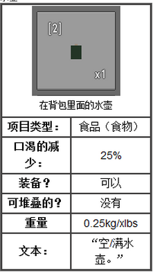水壶是一 罕见的饮具,可以在工业和军事基地发现。食用时,它减少25% 渴。