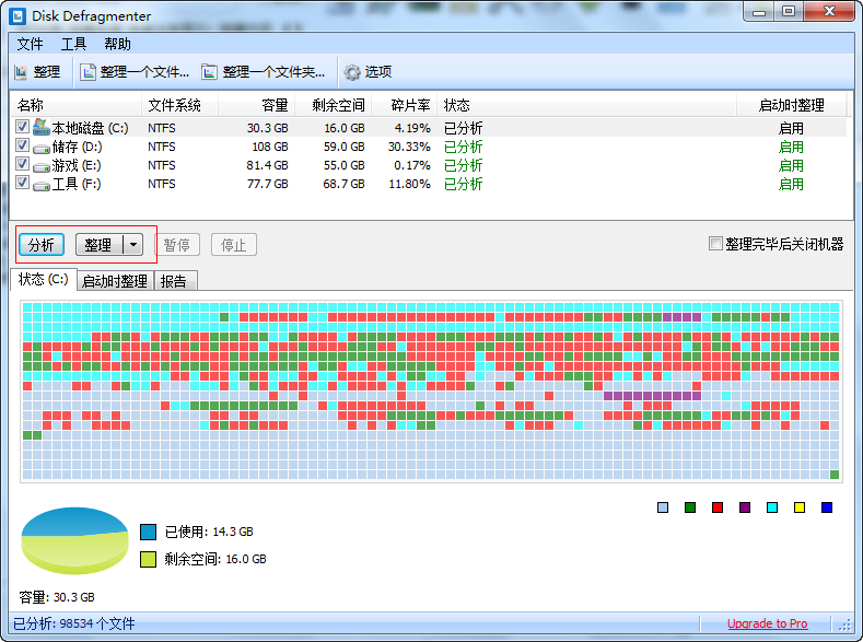 显然与大型彩色界面,标签按钮和标签标记整理磁盘碎片显示和设置,提供所有基本功能,因此它很容易操作对于新手和专家。