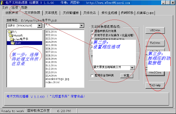 电子文档处理器是一款文档格式转换、文档处理软件集,电子书批量制作工具(目前支持CHM和HELP格式),帮助文件及技术资料的快速制作工具。利用软件快速处理、转换电子文档,快速制作help和chm格式的电子书或帮助文件,减少手工操作,满足用户对迅速处理大量文件的需求。