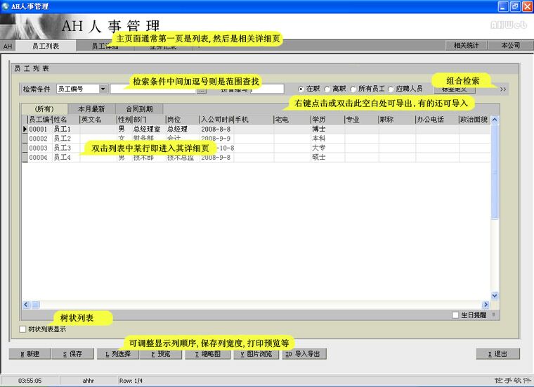 AH人事管理系统是一款专业的企业人力资源管理HR软件,软件界面新颖友好,直观简洁,任意条件模糊查找,可以导入导出数据,多种灵活的自定义功能使之能适用于各种企事业单位的人事管理需要。