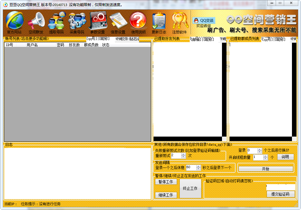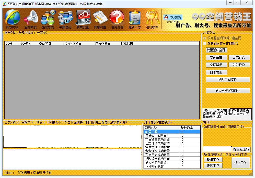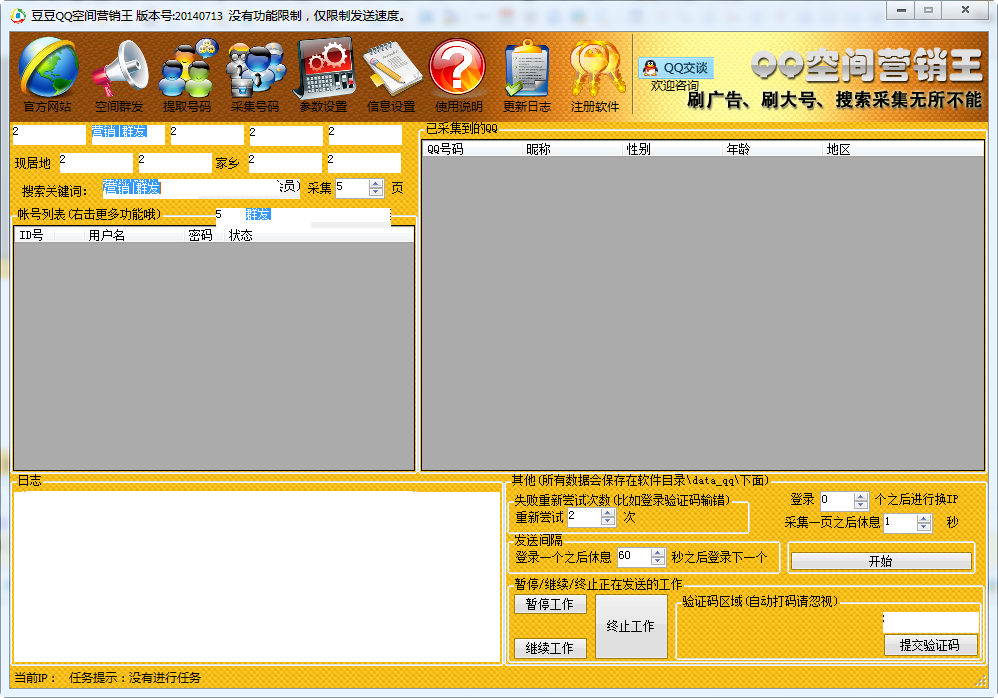豆豆QQ空间营销王是一款功能强大的QQ空间营销软件,全自动签到/留言/评论/留痕/发日志/改资料,一天进行几十万次群发。软件采用多线程进行发送,发送速度无与伦比,是一款非常优秀的空间营销软件。