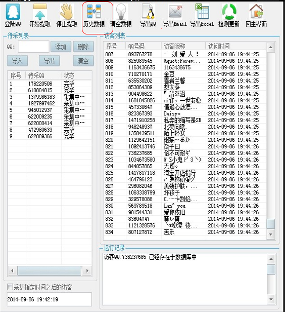 5.2 导出历史数据:点击“历史数据”,查询指定QQ、指定时间段的访客,查询完毕后,点击导出QQ、导出Email或导出Excel,即可导出;