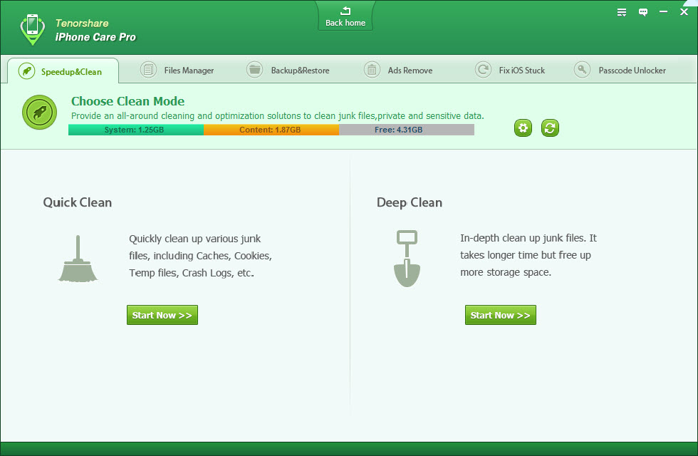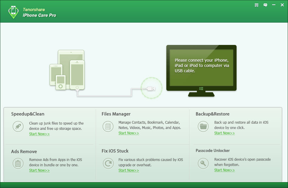 Tenorshare iPhone Care Pro 是一款专业的iPhone优化软件,通过调整你的 iOS 设备到最佳性能。这个工具被进一步分成 6 个小工具,专门修复某些问题。您可以下载 Tenorshare iPhone Care Pro 后,通过计算机修复各种 iPhone 问题。