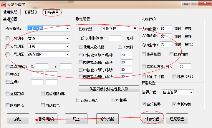 2、这时打怪的话,就选择“打怪设置”,在进行自己需要的设置,就是“保存设置”之后,点击【启动】