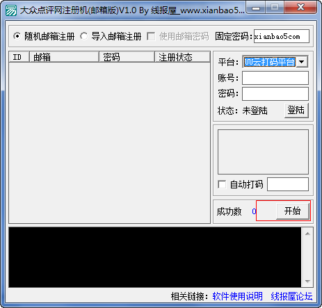 大众点评网注册机是一款你能够通过邮箱来批量注册大众点评帐号的工具,本软件拥有自动打码功能,自动一键注册,非常适合广大使用者们使用,可以注册各种小号来参加各种活动,非常的便捷实用,有需要的可以下载试试。
