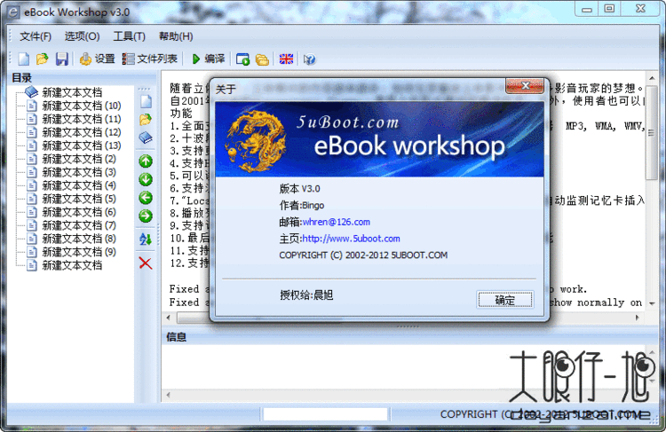 eBook Workshop (原亿唯e书,现中文名:e书工场 )是将 HTML 页面文件、图片、Flash等捆绑成 EXE 电子文档的制作程序。本程序可以说是吸收了目前其他同类程序的优点,采用文件流技术,所有文件都在内存中释放和读取,不产生垃圾文件;程序采用界面外壳,制作时可以选择界面,界面优美,可以不断升级界面;制作的电子书可以部分或全部加密,从而保护制作者的利益, 是制作EXE电子图书最好的选择。