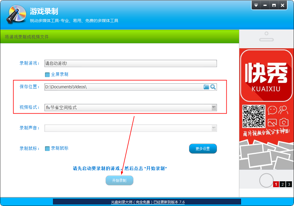 3、设置录像保存位置和录像视频格式,然后点击【开始录制】