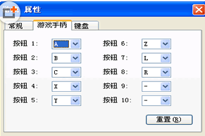 在游戏运行中按 F1 键,会显示游戏属性对话框,如右图。这个窗口可以自行分配游戏手柄和键盘的按钮设定。 按「重置」键,就可以回复为系统默认设定。