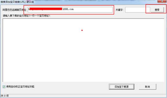3.弹出“搜索添加宝贝链接”对话框,,填入阿里巴巴店铺的【首页网址】(注意:是首页网址,非产品网址),点击搜索