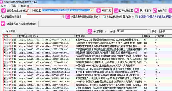 6.接下来我们就可以 开始下载 生成淘宝助理数据包了,如下图,选择 保存文件位置,点击“开始下载”(当然,下载只会下载勾选的宝贝,软件默认是添加进来全勾选,如果只想下载几个,可以自己去掉勾选项)