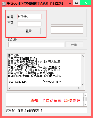 3、填写说说ID,然后点击【开始】即可开始自动刷说说评论