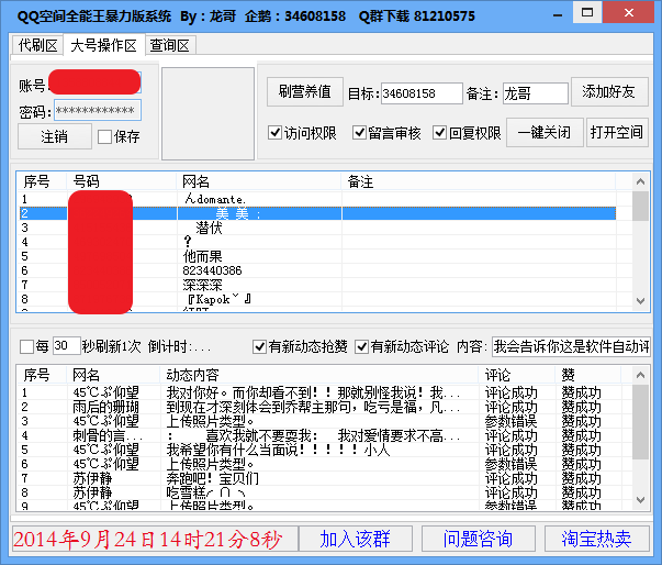 大号操作,登录后,可以查看空间动态,秒赞、秒评论等,这些都是软件自动评论的。功能很强大。