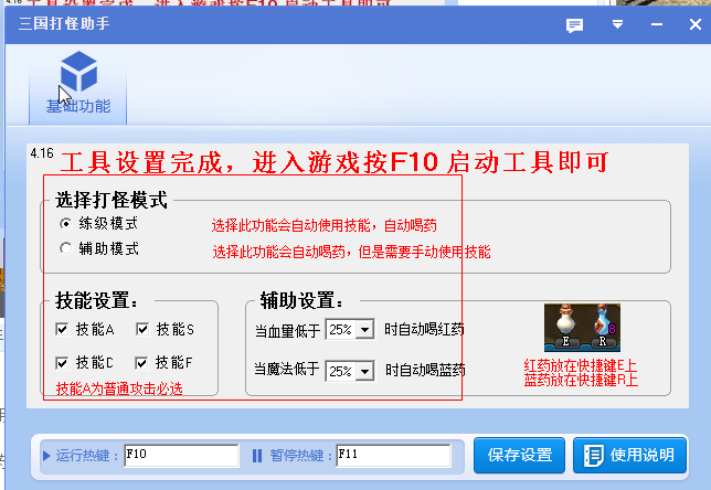 步骤6:如果你希望自行使用技能,小助手只需要帮你辅助喝药,你可以选择“辅助喝药”后保存脚本设置,再进入游戏按运行热键F10开启辅助工具,这样你就可以自己使用技能了