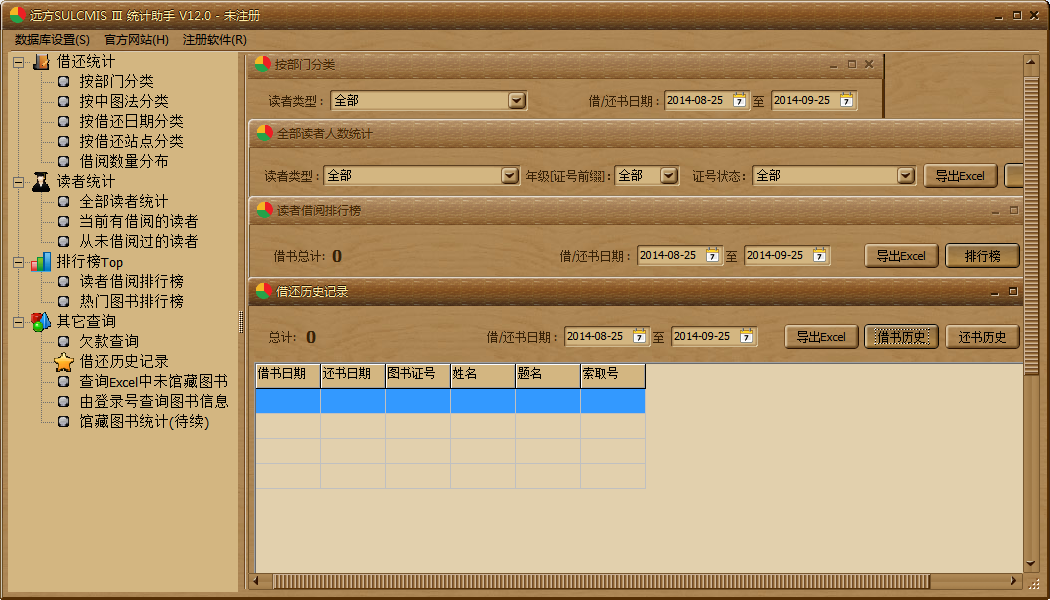 远方SULCMIS Ⅲ统计助手(图书统计助手)是一款绿色好用的由远方软件官方开发的结合深圳大学图书馆信息管理集成系统SULCMIS Ⅲ数据库使用的图书统计助手。软件功能强大,提供了借还统计,读者统计,排行榜TOP和其它查询等强大功能。