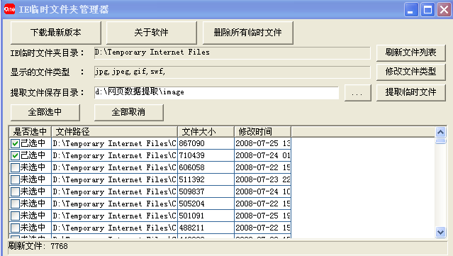 2、增加了IE临时文件管理功能,可以方便地删除IE临时文件以及方便地提取任意IE临时文件。