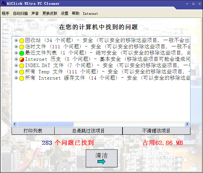 A1Cleaner 是注册表吸尘器 (RegVac) 的姐妹产品. 是超强的系统清洁工具. 它可以扫描系统中 70 多种的LJ文件, 并且附带七个额外的清洁工具. 同时它还有强大的恢复功能,每次清理前它都会将要删除的文件打包成一个压缩包, 万一出问题了可以方便的恢复. 同时, 它在删除文件时会自动检测此文件的重要性, 提示你进行相关的操作.