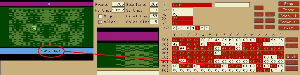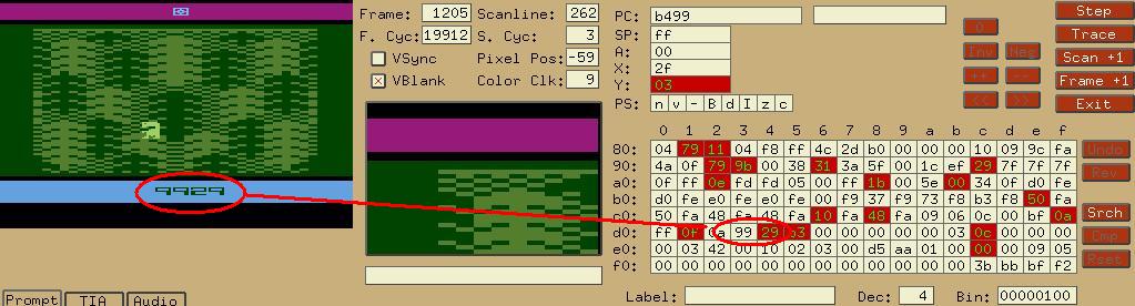 对表中其他数据有兴趣的话,请开启Stella的Debug模式(按左上角的`键)自行研究(游戏会暂停,注意离开时不要按窗口右上角的X,那样会把模拟器直接关闭!)