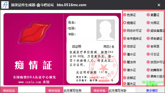 奋斗吧搞笑证件生成器是一款绿色免费的搞笑证件制作软件,可以用来制作各种搞笑娱乐证件图片,支持上传照片做头像哦,什么处男证、色狼证、痴情证、光棍证全都可以办,非常好玩!