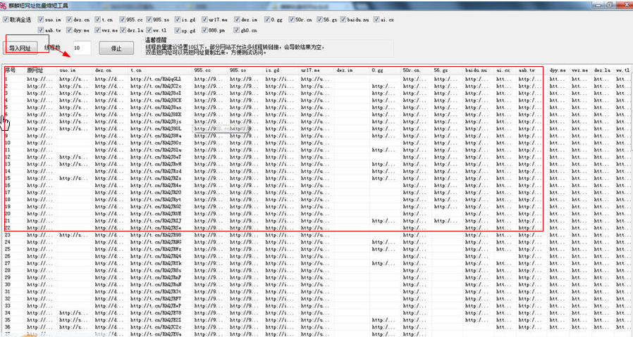 1、该软件支持21个网站,导入网址,可批量生成短链接地址,还支持多线程的。