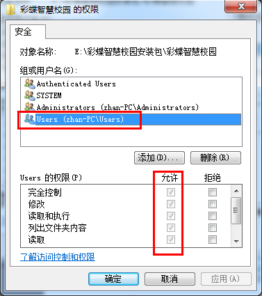 1、在 【彩蝶选课软件】 文件夹上点击右键、安全,设置为 User 用户完全控制(可读写)