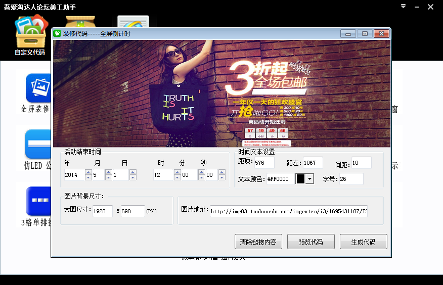 吾爱淘达人论坛美工助手(淘宝店铺装修软件)是一款绿色免费的适合淘宝店铺装修的软件。软件功能强大,为淘宝店家提供了全屏装修代码,活动倒计时,仿LED公告,单张全屏海报等众多实用功能。所以淘宝的朋友们福利是必须一直存在的,后期更新。软件自带一些装修软件工具下载地址,如PS,Flash等。还有一些比较实用的网址导航。是淘宝美工们的装修辅助。