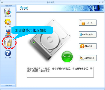 点击软件左侧功能操作“保密碟”图标进入硬盘格式化及加密操作界面。
