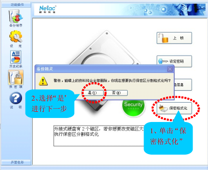 单击”保密格式化”按钮开始硬盘分区。此时将弹出警告窗口,确定后单击“是”进行下一步。