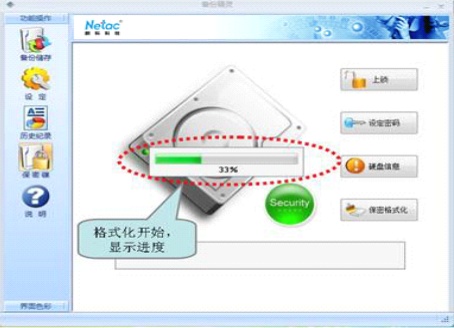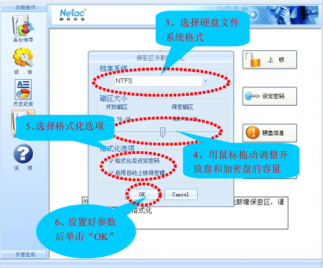 ①保密格式化(警告:每次加密分区前都必须进行格式化,格式化后硬盘内所有资料将被全部删除)