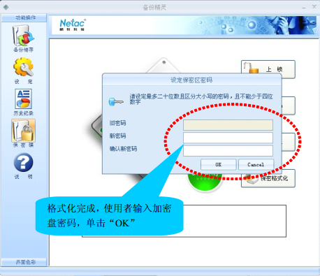 格式化完成后,将会弹出输入密码窗口如下。在对应窗口内输入相应加密盘密码,单击“OK”即完成保密盘初始化。