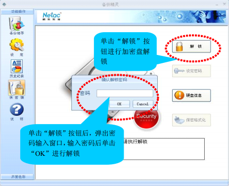 解锁:单击”解锁”键,在密码输入窗口中输入预设密码即可解除加密盘的锁定状态。