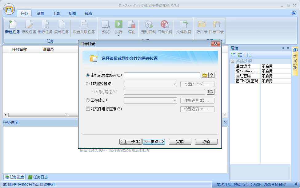 任务执行时中途可以随时中止,已经备份的文件将自动作记录,下次执行时不再重复备份