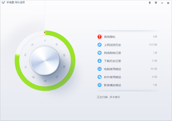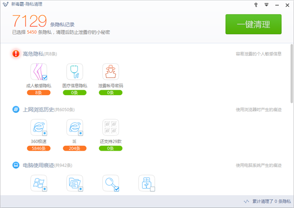 新毒霸隐私清理是从新毒霸开发版中提取的一个隐私清理软件,可以清理掉一些日常上网和使用电脑过程中留下的隐私记录,包括“高危隐私”、“上网浏览器历史”、“网络购物记录”、“下载历史记录”、“电脑使用痕迹”和“影音使用痕迹”等。