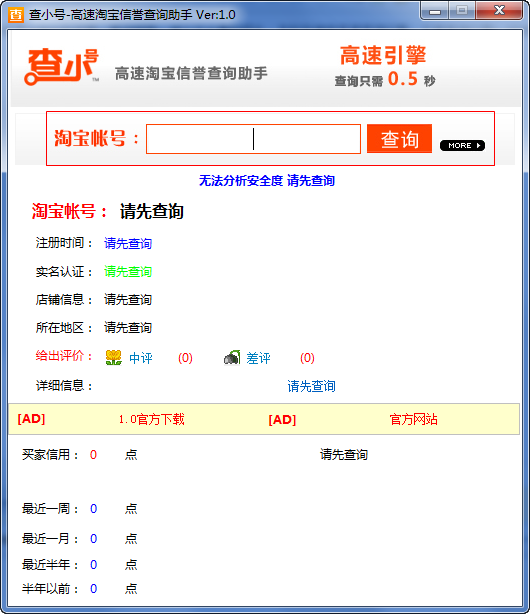 查小号-高速淘宝信誉查询助手是一款永久免费的淘宝信誉查询工具。能够帮助卖家快速识别风险买家、差评师等。减少不必要的损失。本软件使用高速查询引擎,正常查询只需0.5秒即可查询完毕。