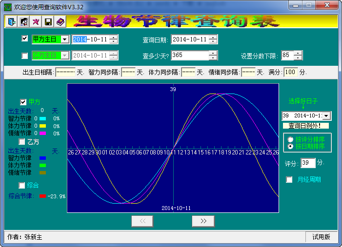 生物节律查询表是一款用于查询人体生物节律的工具,可以用于指导人体的优生优育,找出合适的生育时间。据科学家对人体的智力、体力和情绪三种生物节律研究发现,当人的各种生物钟运行高潮期时,人的精力最旺盛,办事效率高,智力超过平常;相反,当人的各种生物钟运行到临界期(由高潮期转入低潮期或由低潮期转入高潮期的二三天时间)和低潮期时,人的体力精力下降,情绪低落、办事效率低,工作易出差错。