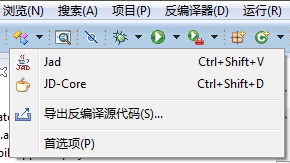 插件提供了系统菜单,工具栏,当打开了插件提供的类反编译查看器后,会激活菜单和工具栏选项,可以方便的进行首选项配置,切换反编译工具重新反编译,以及导出反编译结果。