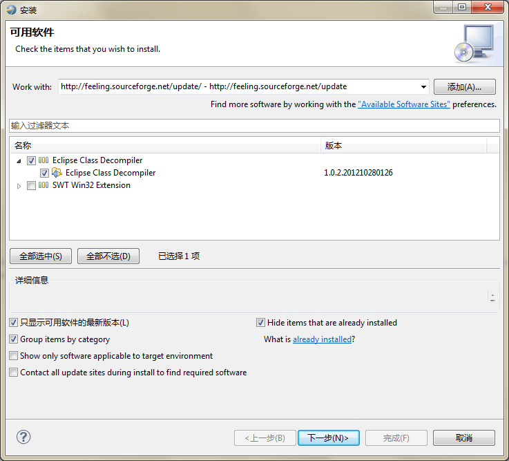 直接使用Eclipse进行更新,支持Eclipse 3.x, 4.x,不依赖任何其他插件,直接勾选更新插件即可。