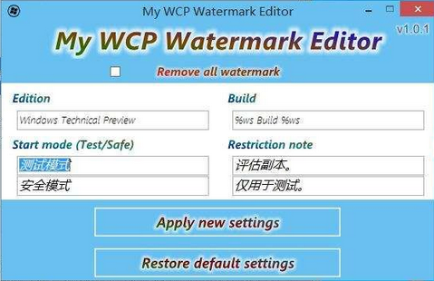 My WCP Watermark EditorÊÇÒ»¸öÂÌÉ«Ãâ·ÑµÄϵͳÓÒϽÇˮӡȥ³ý¹¤¾ß£¬¿ÉÒÔÍêÃÀÐ޸ĻòÕßÈ¥³ý Win 8 / 8.1 ÒÔ¼° Win 10 ÓÒϽǵÄˮӡ£¡