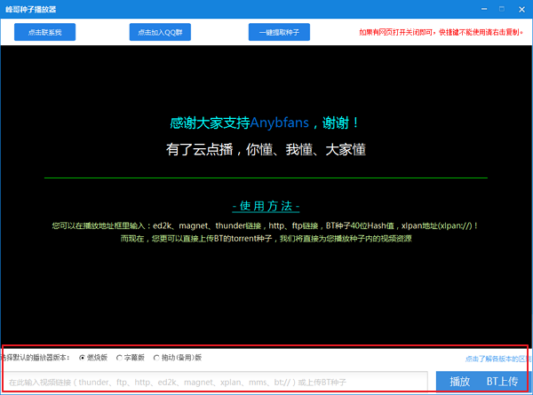 您可以在播放地址框里输入:ed2k、magnet、thunder链接,http、ftp链接,BT种子40位Hash值,xlpan地址(xlpan://)!