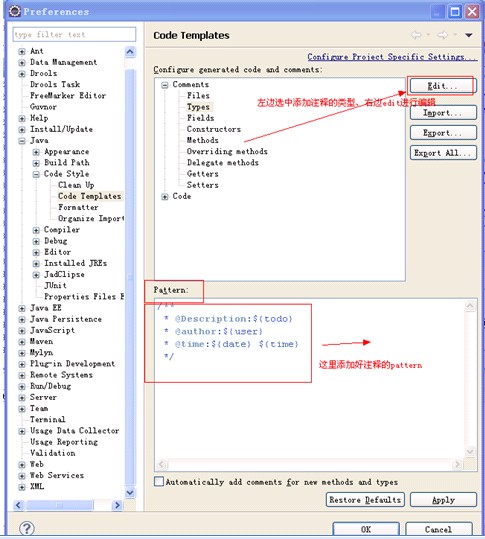 打来:Window->Preference->Java->Code Style->Code Template 然后展开Comments节点,选中你要添加注释的类型,