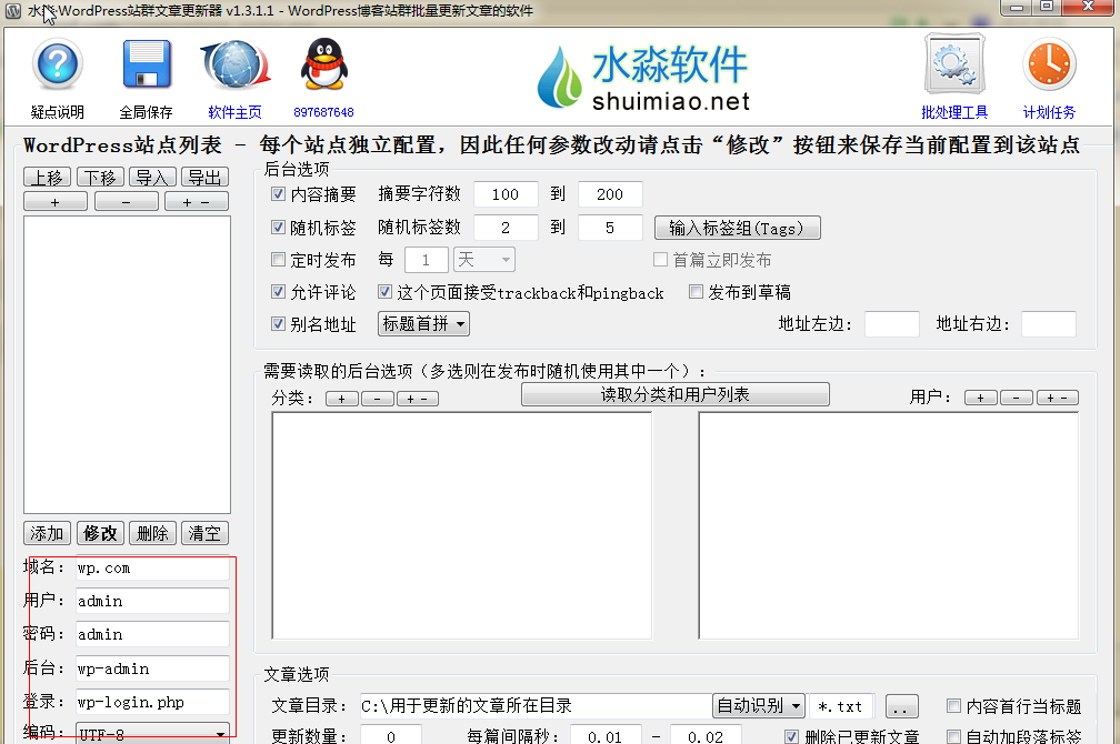 水淼WordPress站群文章更新器就是给同名网站进行批量文章更新的软件,他不但支持指定与随机发布的任务,还能支持定时发布相关的任务,是款值得来下载的软件!